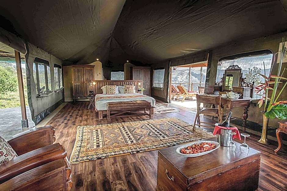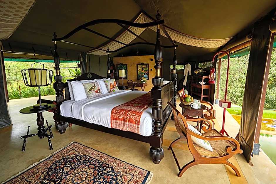 Tent with bedding, a terrace overlooking the plantations and a private bathroom with hot/cold water.